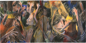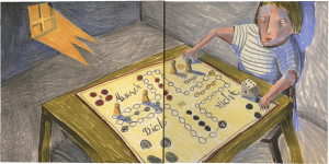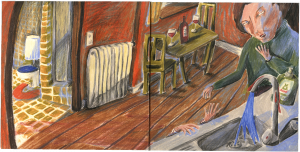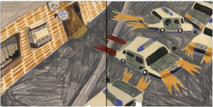 Für die Bildkompositionen dienten die Texte als Inspiration. In der Typografie näherte ich mich den Liedern auditiv. Es ergaben sich beim Hören der Lieder pausen zwischen dem gesprochenen und den rein Instrumentalen Passagen. Das Hören von instrumentalen Abschnitten und das Warten auf die nächste gesprochene Zeile, markierte ich durch Auslassungszeichen. Diese wurden zum Stilmittel meiner gesamten Arbeit.